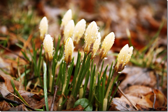 I just love the rain drops and soggy brown leaves surrounding these pretty fresh buds. Oh glorious Spring!