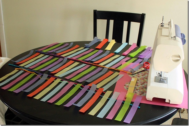 The next step was to orientate the paper horizontally and cut 1” strips of all the paper. {Does anyone else still think “hot dog” vs. “hamburger” when doing crafts with the paper vertical or horizontal? Okay, maybe it’s just me.}